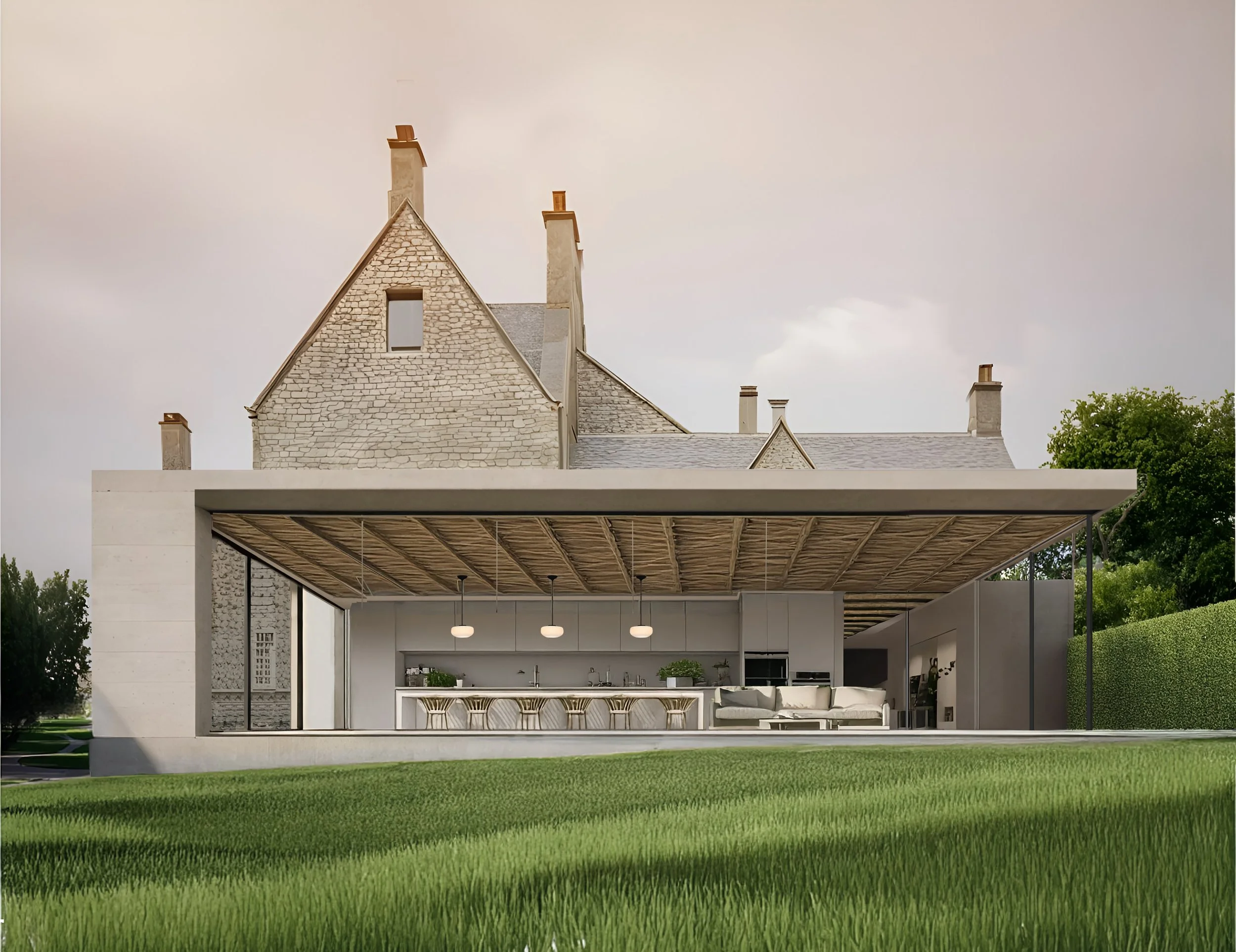 Externally, we have selected a light grey limestone to complement the tones and color palette of the existing house. Internally, timber and thatch have been incorporated into the ceiling design to introduce warmth, balancing the otherwise cool materials of the extension, which are further enhanced by the polished concrete floors. Large floor-to-ceiling windows have been strategically placed to maximize natural light, creating a bright and inviting atmosphere while framing the expansive views of the surrounding landscape. This thoughtful integration of the interior and exterior spaces fosters a seamless connection with nature.